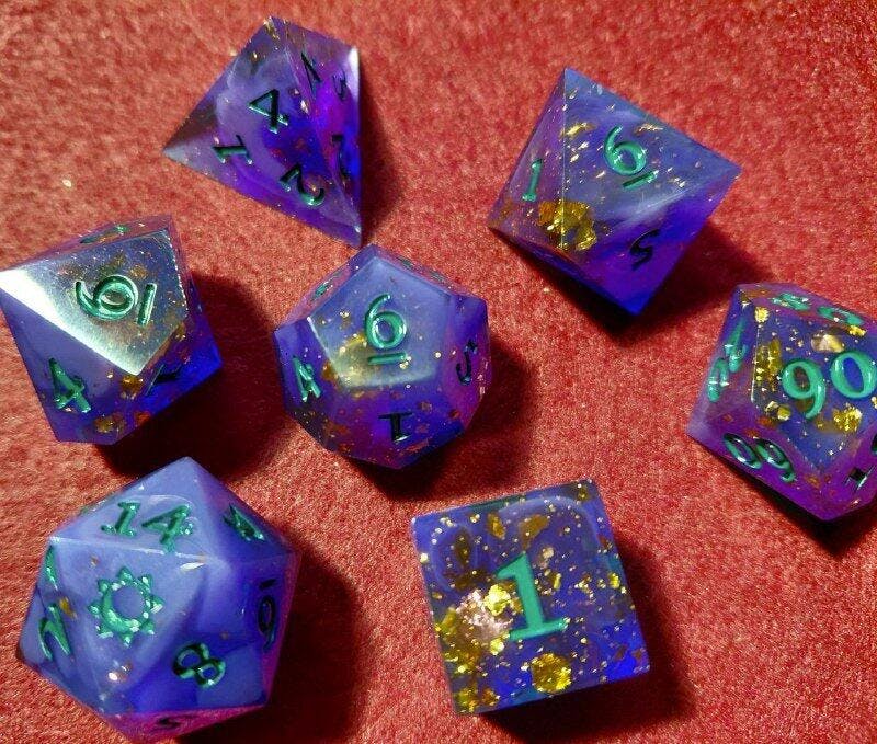 Set of 7 sharp edged epoxy resin polyhedral dice including one of each of the following dice styles: