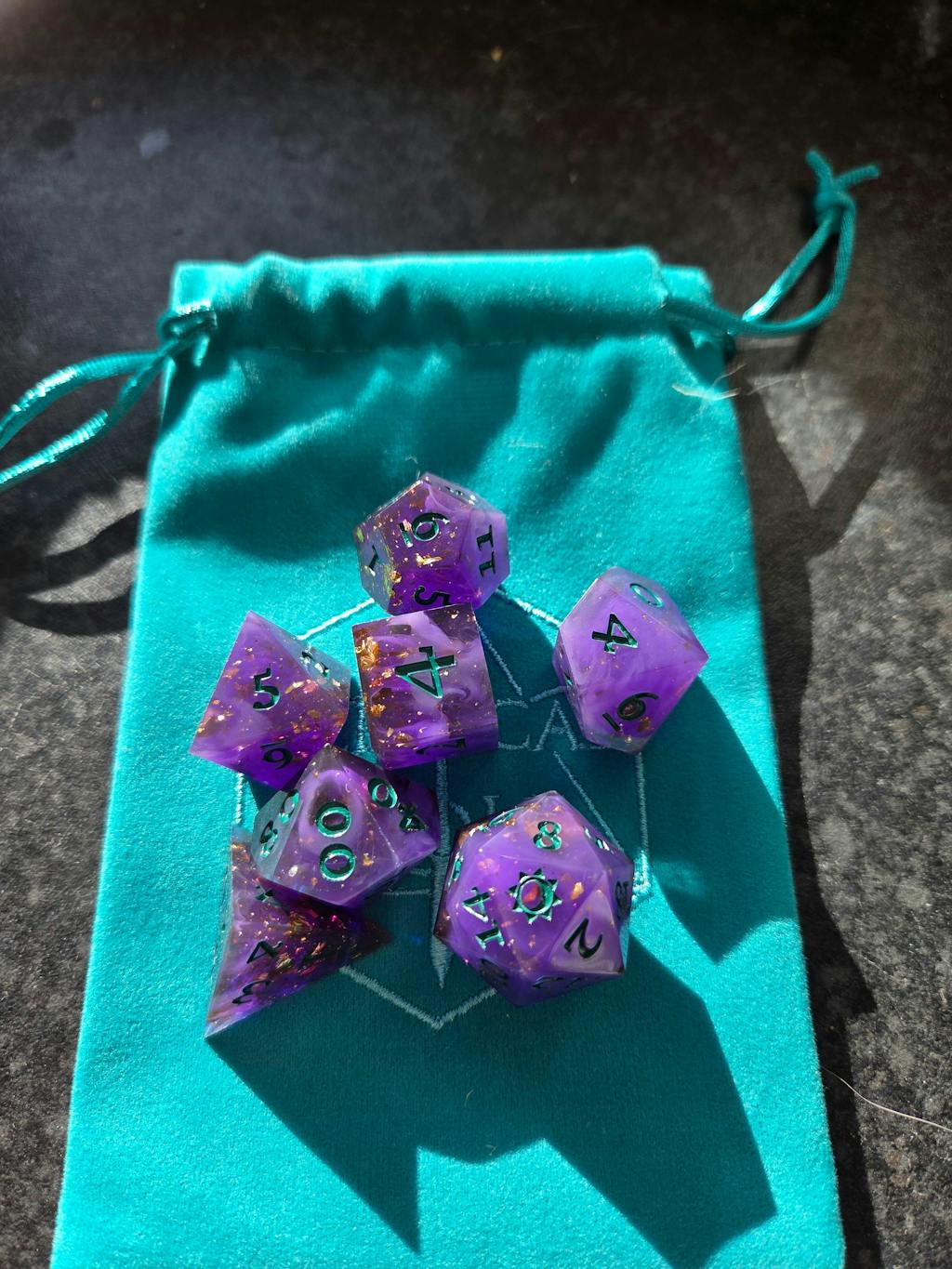 Roll with level 20 dazzle and court a little chaos with these dice inspired by none other than Mollymauk Tealeaf. These striking dice are crafted from rich purple epoxy resin infused with gold shimmer and gold flakes that will catch a glimmer in the light like a carnival with every roll. Each die features coordinated teal numbering for an eye-catching contrast.