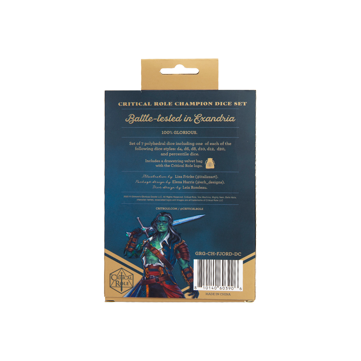 The dice set arrives in a custom designed box with a Critical Role logo shaped window surrounded by art of Fjord fiercely wielding the Sword of Fathoms.