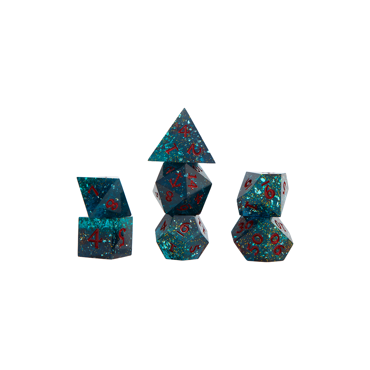 • Set of 7 sharp edged epoxy resin polyhedral dice including one of each of the following dice styles: