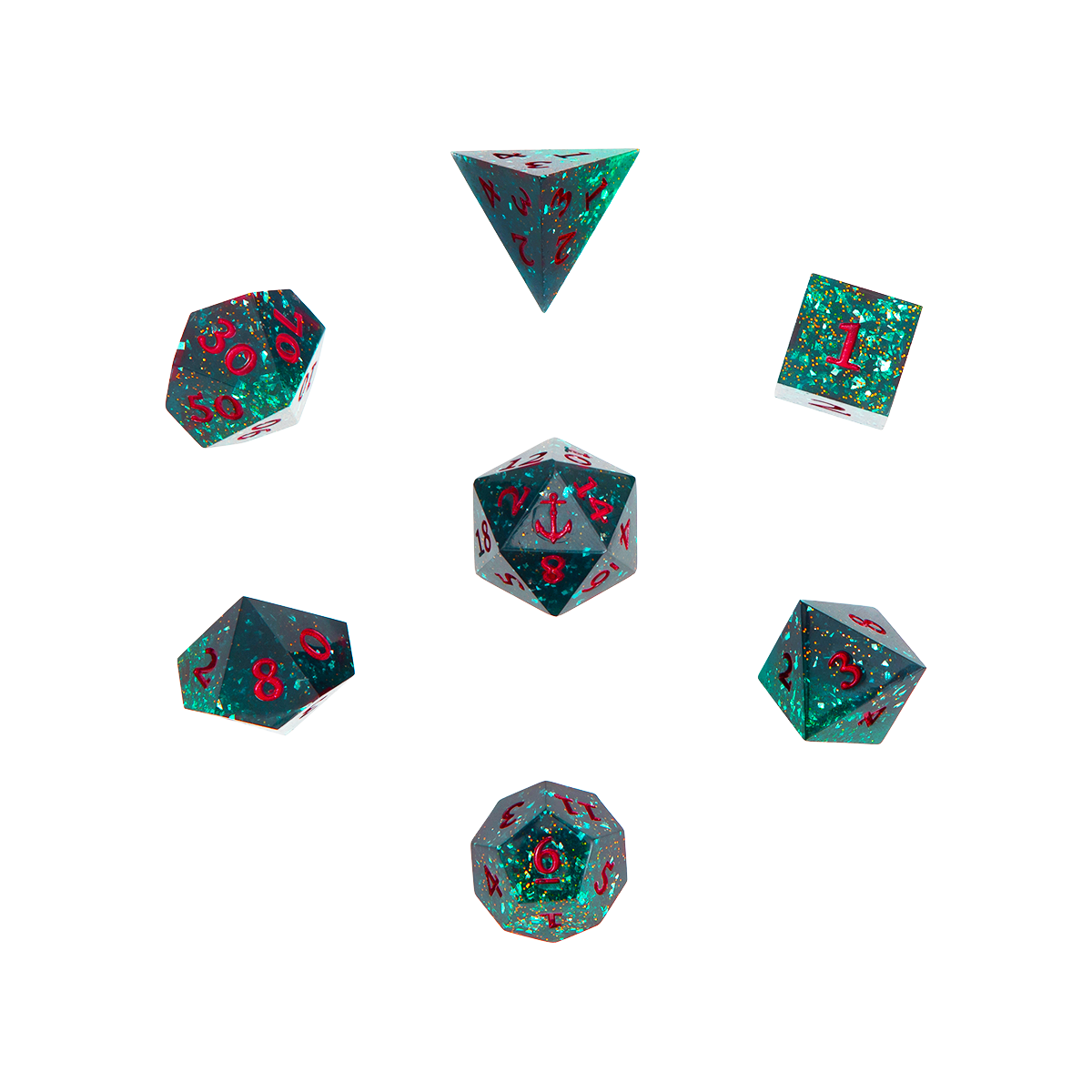 The Fjord Stone Champion Dice Set will arm your next roll to level 20 storm-tossed sea power! Swirled with deep dark green and blue details, these sharp edged epoxy resin dice capture the look of cold ocean depths, accented with golden shimmer and blue foil flakes that glint like the sun on crashing waves against the striking bold red numbering. The d20 bears a custom anchor symbol on the 20 face—a nod to Fjord’s nautical origins.