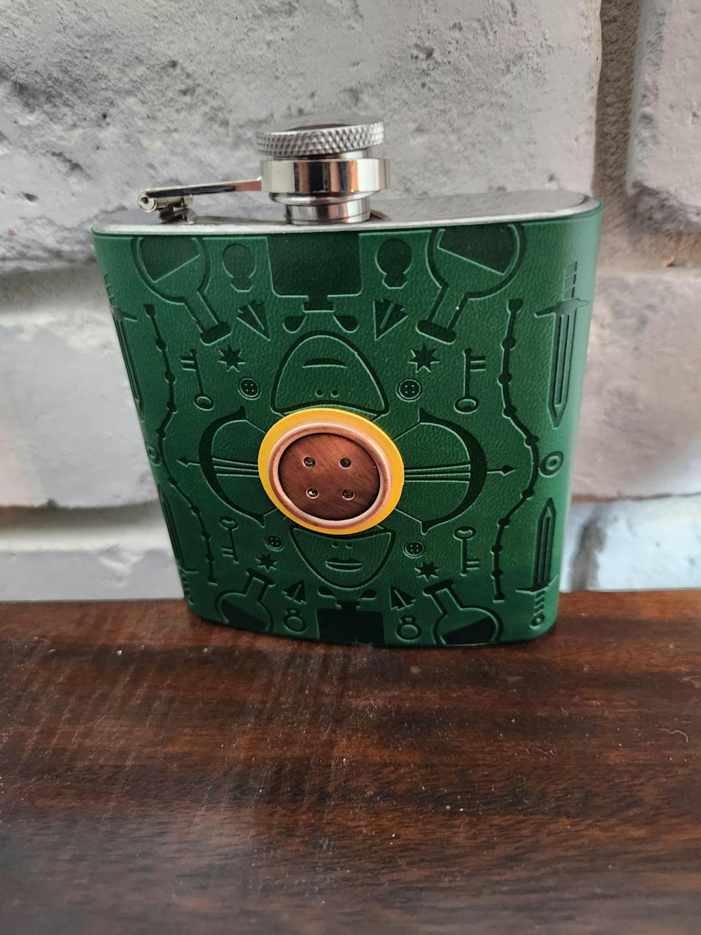 Our Nott the Brave Flask is wrapped in beautiful green vegan leather with debossed symbols representing Nott the Brave AND a fancy button icon on its front. Unfortunately, Pumat was not available for enchanting, so infinite booze is not included. You can, however, fill this flask up with the six ounces of the drink of your choosing.