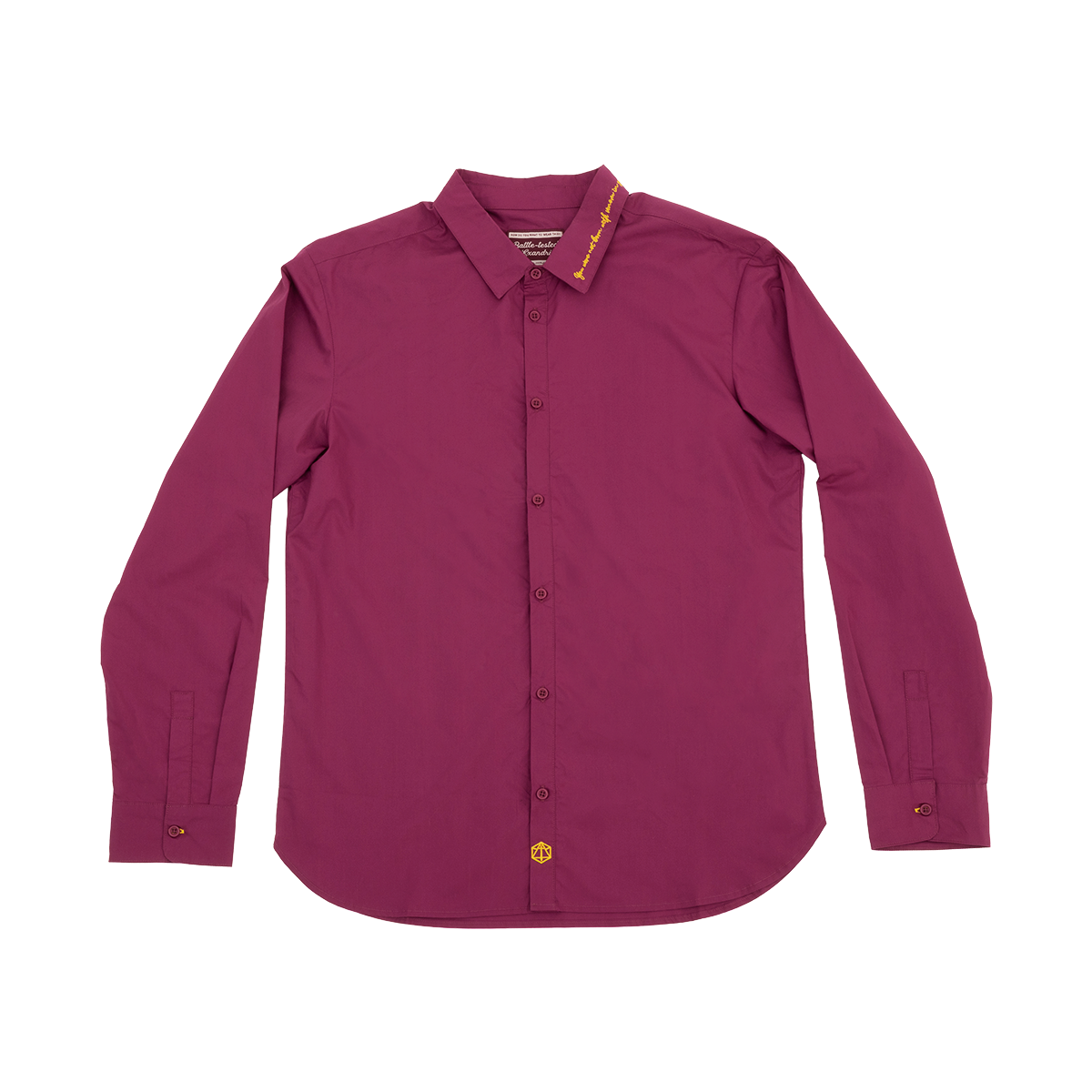 A line of gold embroidery offers this quiet reminder—“You were not born with venom in your veins.”—along the collar of this dark purple long-sleeve-button-down. Drawing inspiration from Caleb Widogast, this piece is designed as a subtle, everyday wearable with a nod to a mighty story beneath the surface. Tailored in a comfortable unisex fit and crafted from 100% cotton, it allows versatile styling meant to move easily from the table to your other worlds. Wear it on its own or layered under the Essek Thelyss Knit Pullover Sweater Vest.