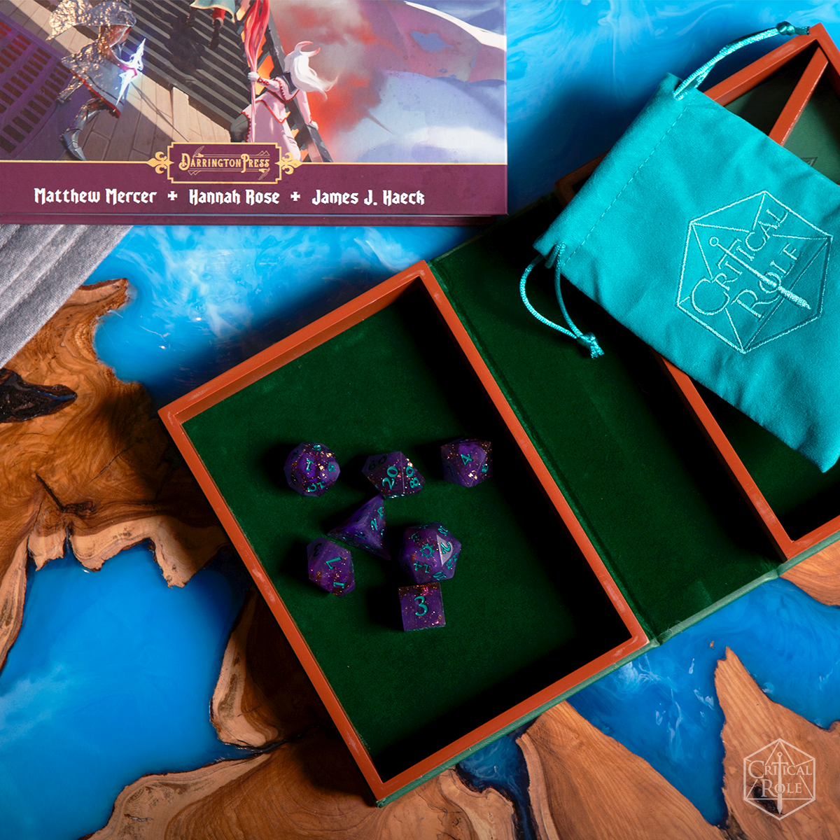 - Includes a teal velveteen drawstring bag with an embroidered Critical Role logo.