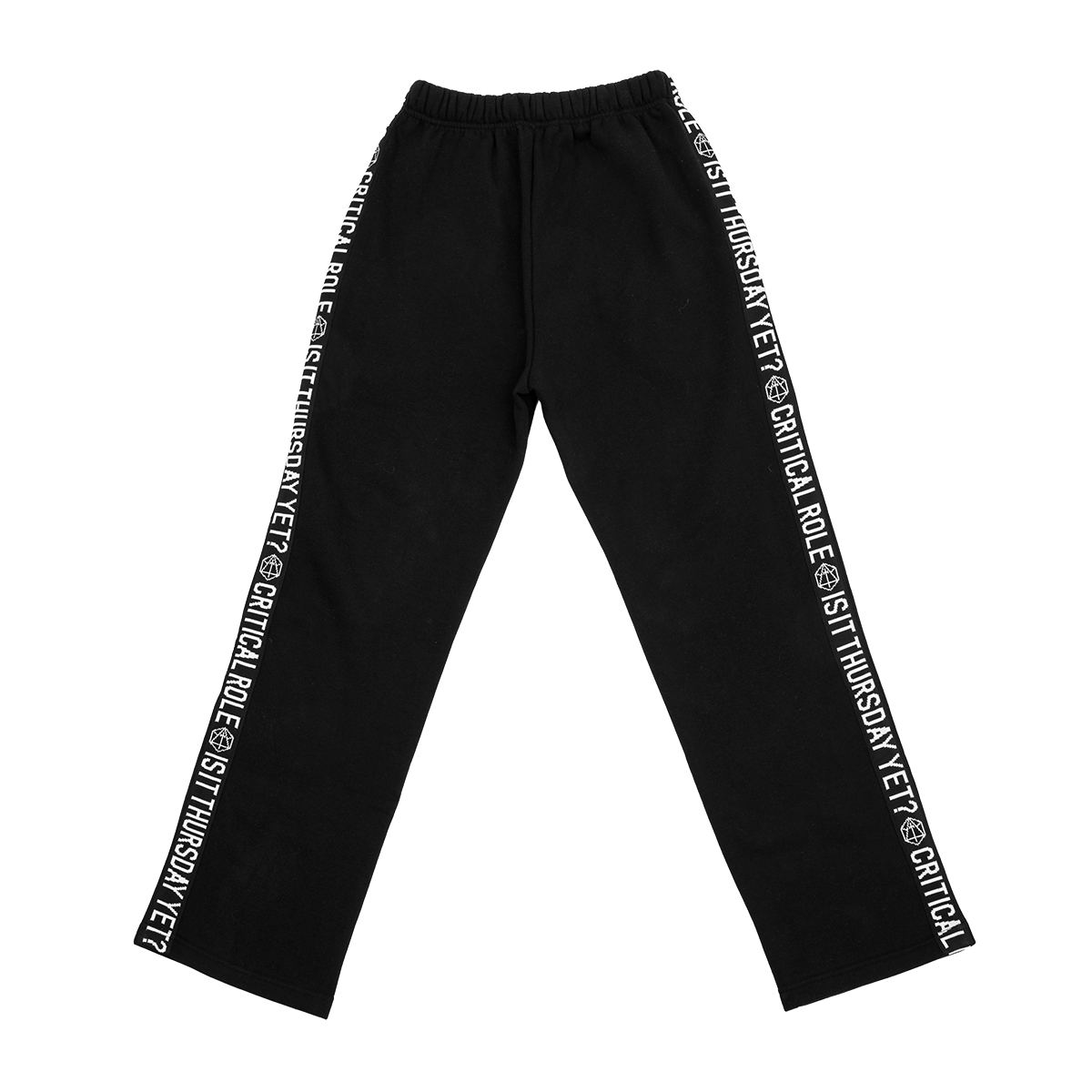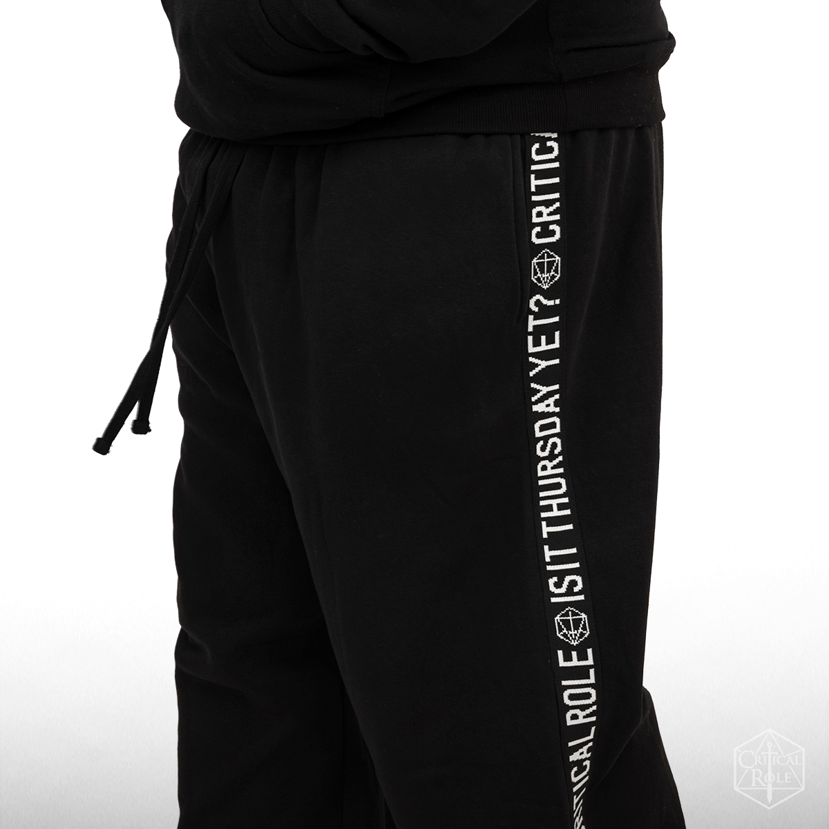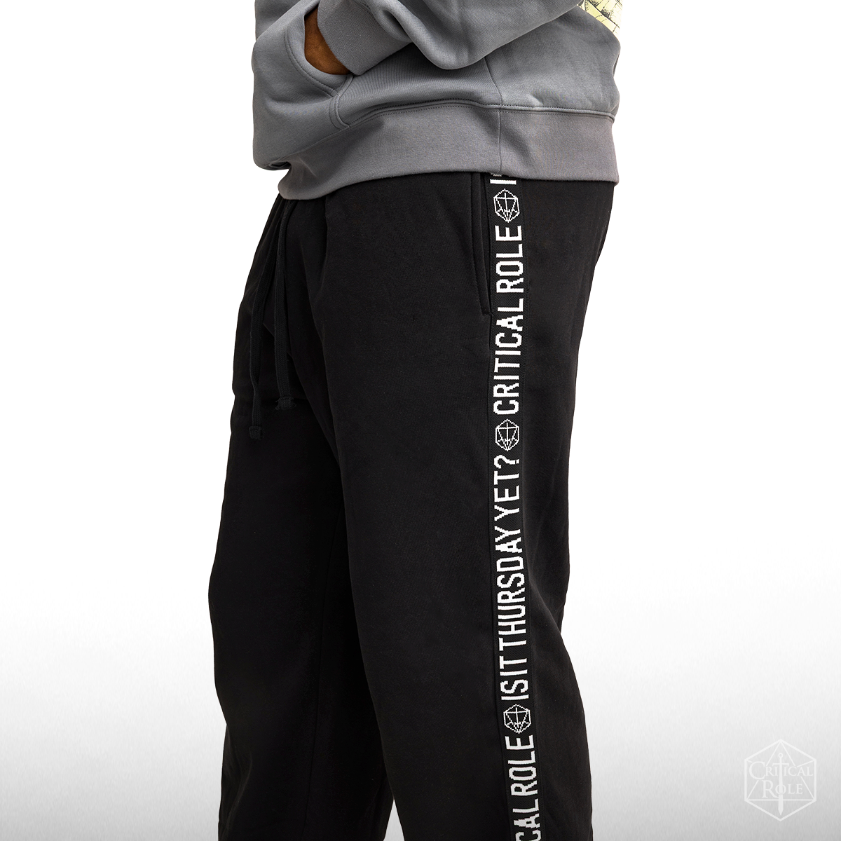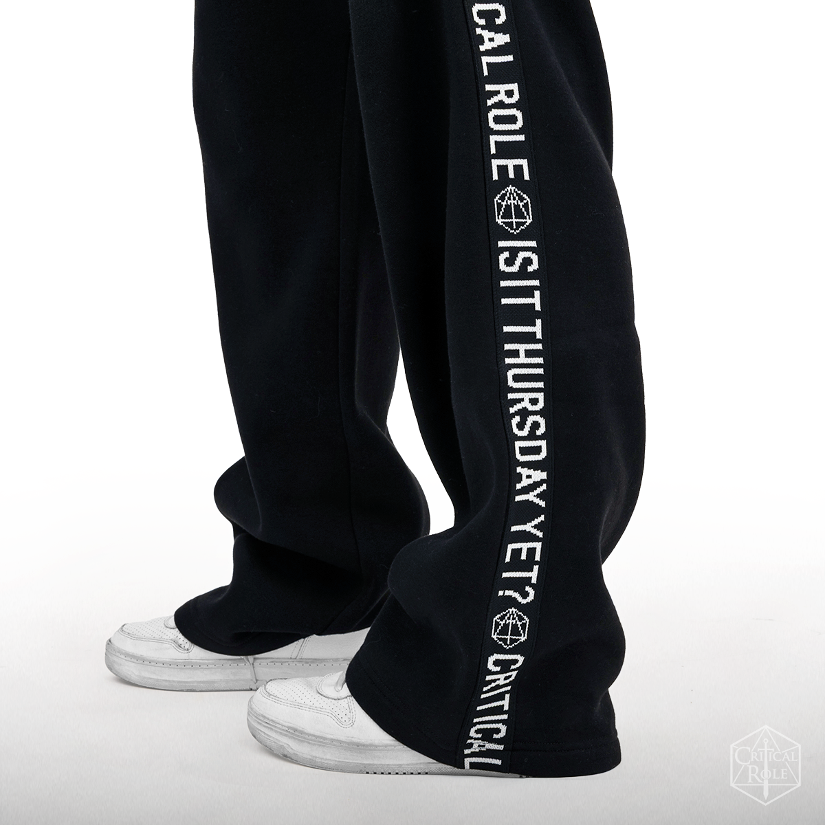 To keep the adventure close, each leg is finished with tonal woven tape down the side, embroidered in crisp white with CRITICAL ROLE and the question every Critter knows by heart: IS IT THURSDAY YET?