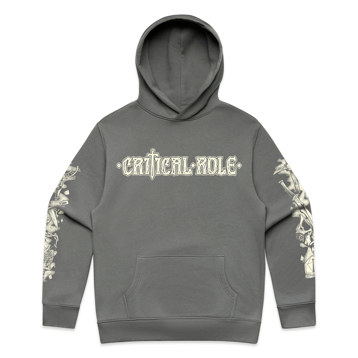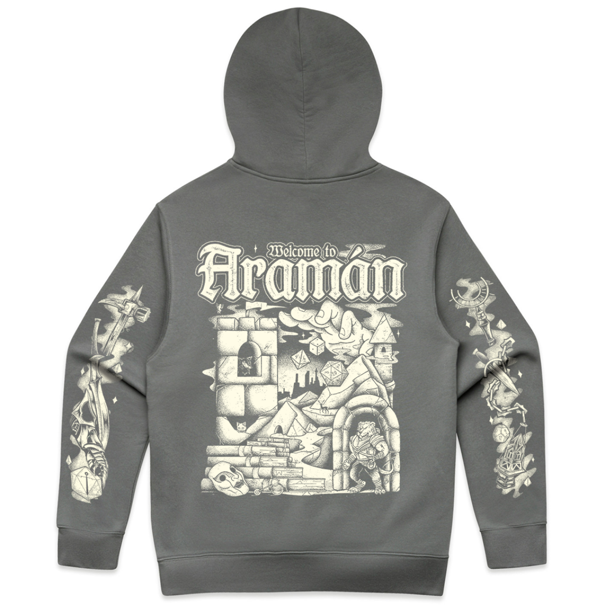 Step into the story before the dice even fall with this dark gray pullover hoodie that feels like a Thursday evening at the table—extra cozy! Across the chest, Critical Role appears in a stylized handwritten script; turn it around, and the journey opens up an oversized illustrated Welcome to Aramán within a retro-inspired RPG scene layered with C4 secrets to be discovered. Teor stands ready for battle on the journey ahead, while Bolaire’s mask and Murray’s eyeglass rest against a stack of well-worn books. Thaisha’s deer familiar keeps watch in the distance as Occtis’ companion Pincushion and Kattigan’s loyal Wulferic peek out from the tower’s shadow. Above it all, Thimble circles the sky as a Game Master’s hand appears overhead scattering falling dice.